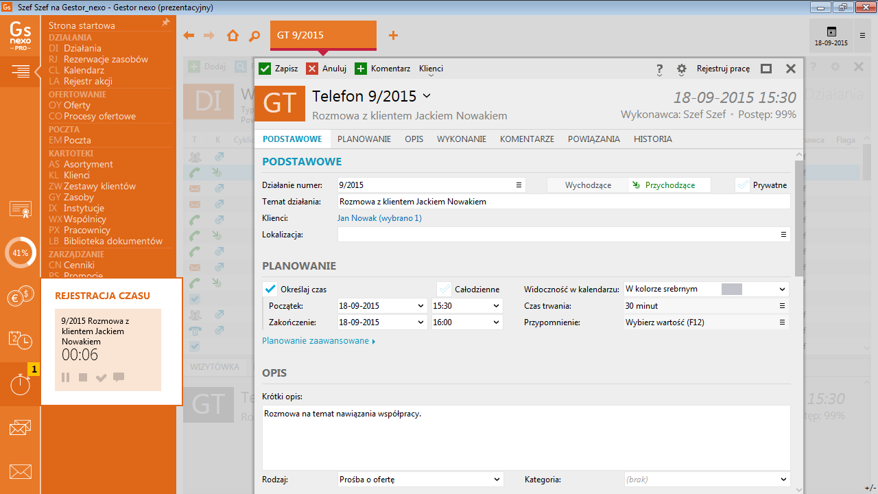 - możliwość planowanie oraz rejestrowania etapów wykonywania działań (zadań, spotkań, telefonów, faksów, listów, notatek, rozmów internetowych, wiadomości e-mail) prowadzonych w firmie, zarówno dotyczących klientów lub odbywających się z ich udziałem, jak i niezwiązanych z klientami;